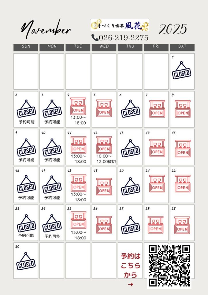 「手づくり喫茶風花」11月の営業日に関して