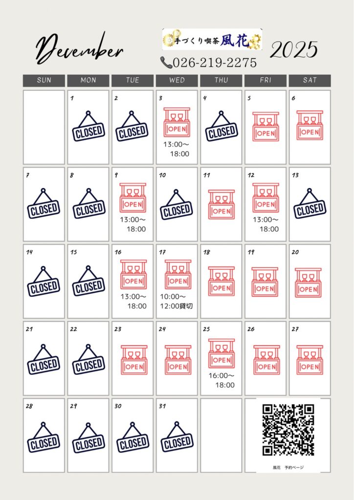 「手づくり喫茶風花」12月の営業日に関して