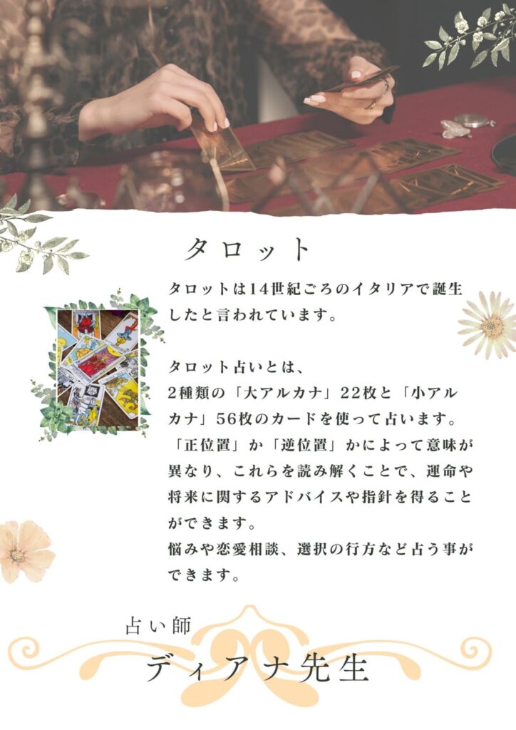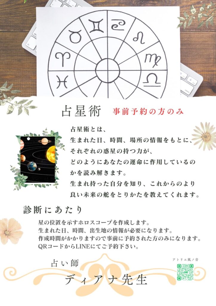 30年以上の実績を持つディアナ先生をはじめ、信頼できる占い師があなたの心に寄り添います。ここでは、西洋占星術から東洋の占術まで様々な占いを選ぶことができ、きっとあなたにぴったりの方法が見つかります。遠方の方もご安心ください、オンラインでの鑑定も承っております。また、占いに興味がある方、プロを目指したい方に向けての占い講座も人気です。